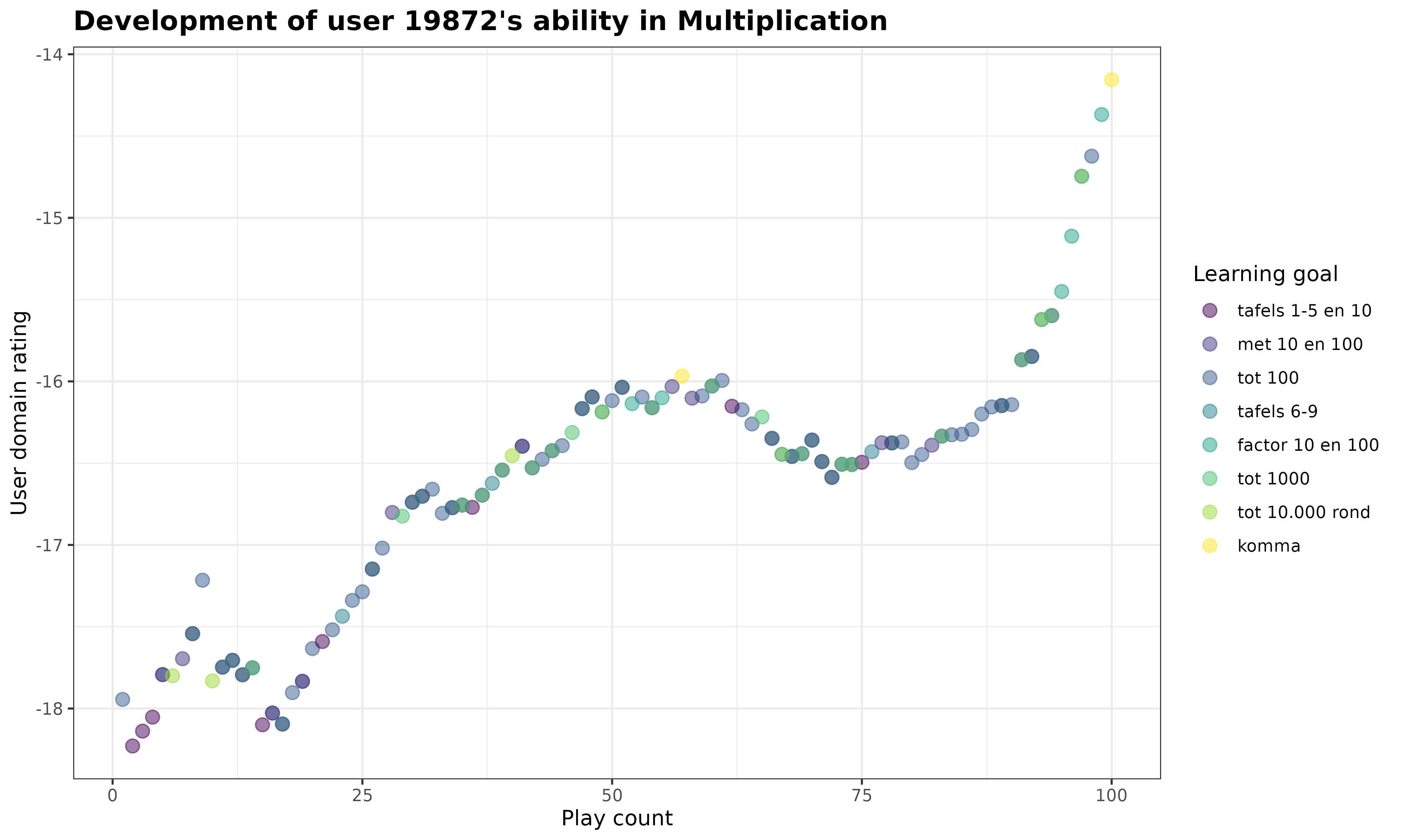 )We are now ready to make the ggplot for this assignment. In this plot, we visualize how the student’s new_user_domain_rating changes as the student plays within the Multiplication game. We also add an color aesthetic to the plot that indicates for each answered item to which learning goal it belongs.